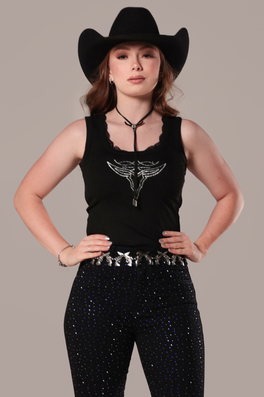 Uma peça que é puro charme e presença no estilo country! Essa blusinha é feita em malha canelada de algodão com elastano, garantindo conforto, elasticidade e um caimento impecável no corpo. Suas alças mais largas trazem um toque de elegância e firmeza, enquanto o bordado frontal em formato de chifre adiciona aquele detalhe autêntico e marcante do universo western. Combine com calça jeans, cinto e bota pra montar um look cheio de atitude e identidade!