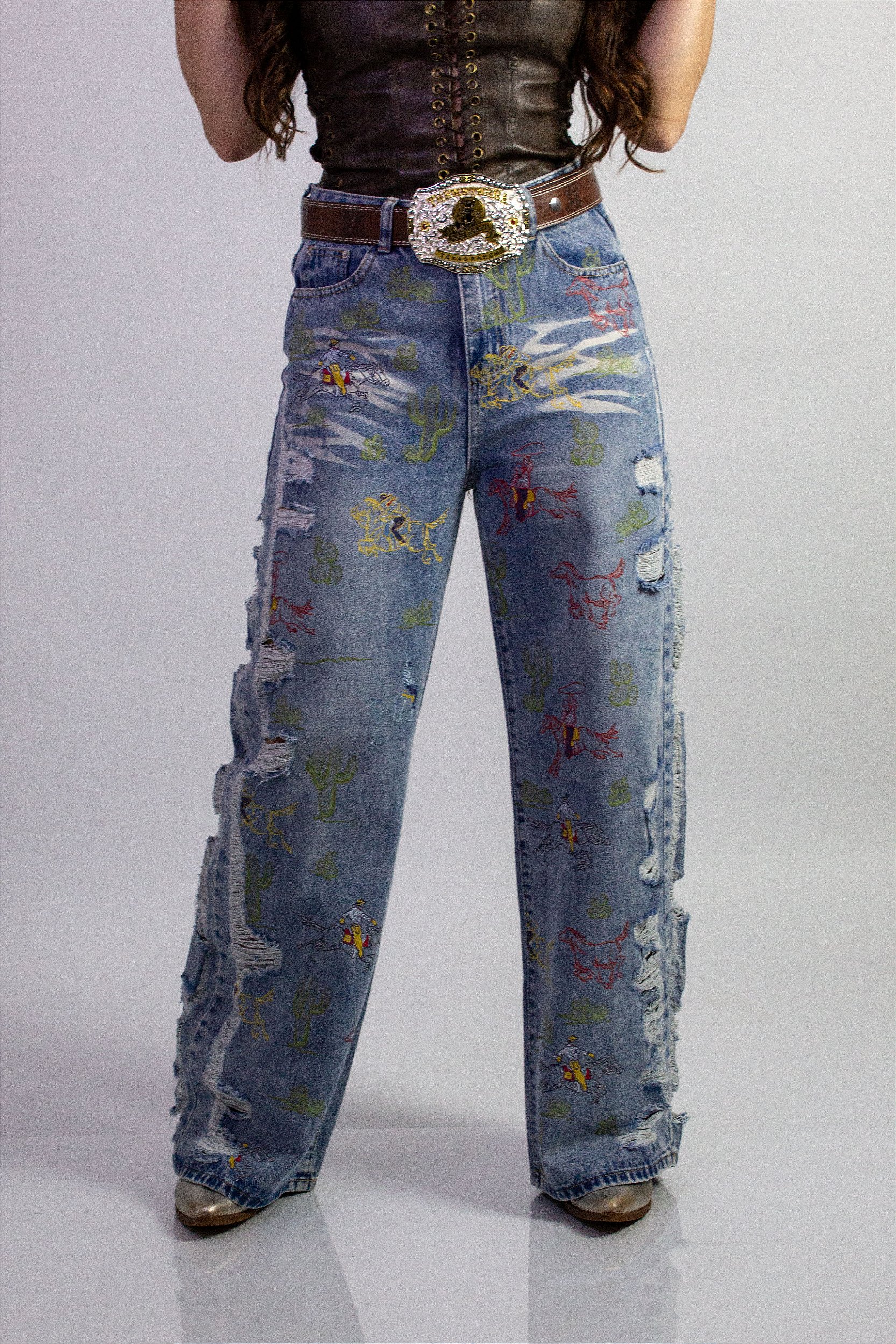 Uma calça que é puro estilo e personalidade! Feita em jeans 100% algodão, ela traz aquela pegada autêntica do country moderno, com lavagem azul e efeitos stonados que deixam o visual ainda mais marcante. O destaque vai para os rasgos nas laterais e as estampas exclusivas com desenhos clássicos do universo western — um toque ousado e cheio de atitude. Com modelagem wide leg e cintura alta, ela valoriza a silhueta e garante conforto o dia todo. Se você ama uma peça diferente e cheia de presença, essa calça é pra você — garanta já a sua e arrase em qualquer rolê!