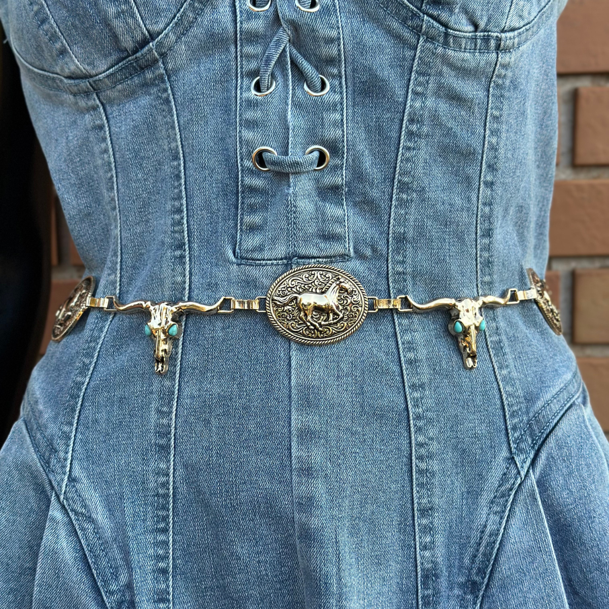 Cinto corrente com acabamento dourado e visual western autêntico, feito em material sintético de alta qualidade e decorado com pingentes em formato de caveiras de boi e medalhões com desenho de cavalo ao longo de toda a peça. Possui sistema de encaixe fácil na parte de trás, garantindo praticidade na hora de vestir e um caimento perfeito na cintura. Ideal para compor looks com personalidade e estilo marcante.