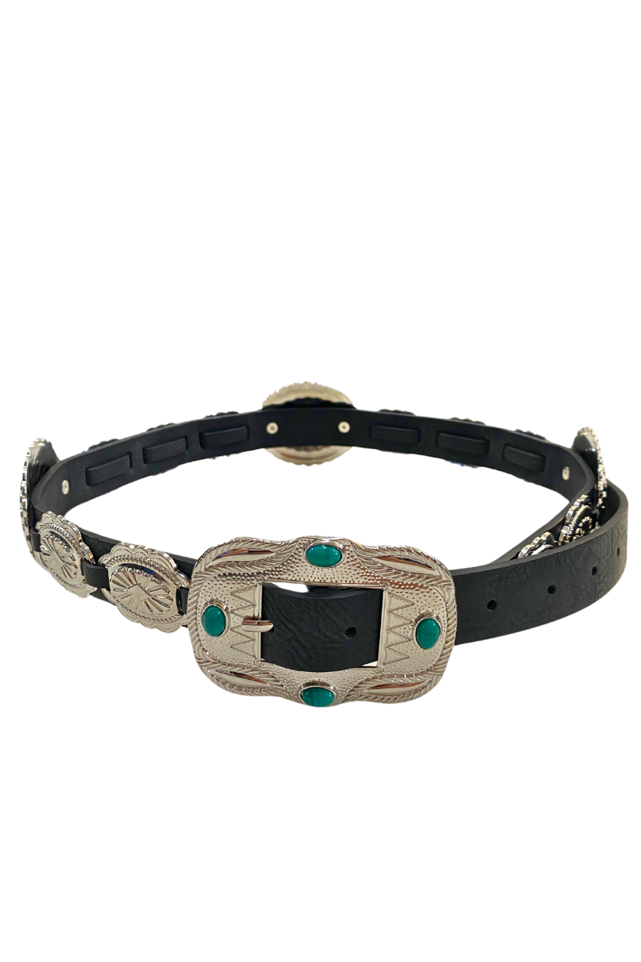 - Possui chapinhas de metal, ao longo de todo o cinto, inclusive na fivela, adornada de algumas pedras verdes;
