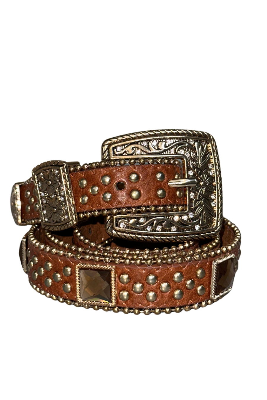 Cinto Country Feminino Slim Marrom Pedras Quadradas Texas Ranch Jeans Fino Delicado Moda Country Couro Sintético Fivela Quadrada Adulto e Infantil.