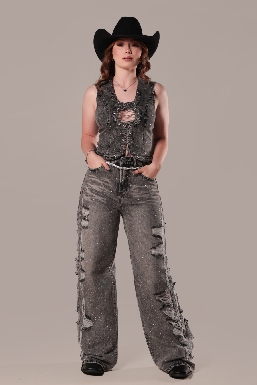 Impossível passar despercebida com esse conjunto incrível da Texas Ranch. Produzido em jeans de alta qualidade, ele é composto por um cropped com modelagem diferenciada e cheia de atitude, trazendo amarração frontal e detalhes em brilhos que deixam o visual ainda mais marcante. Acompanha uma calça wide leg com efeito destroyed e aplicação de brilhos que refletem a luz de forma única. Um look completo, moderno e autêntico — perfeito pra quem quer brilhar em qualquer ocasião country!
