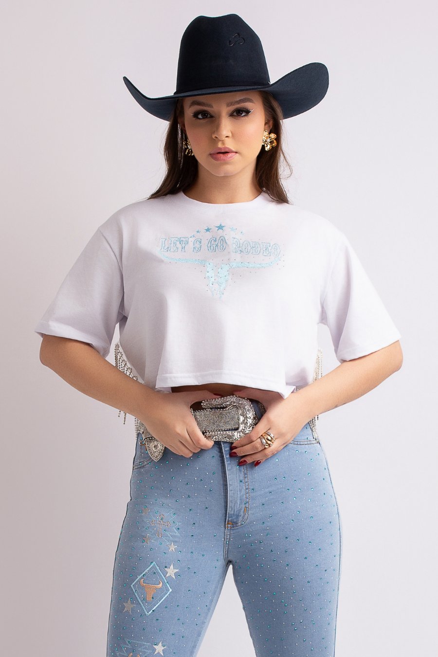 Cropped Branco Let's Go Rodeo Texas Ranch Jeans Algodão Feminino Lançamento Exclusivo Barretos Oversized Bordado Brilhos Strass Franjas Moda Country.