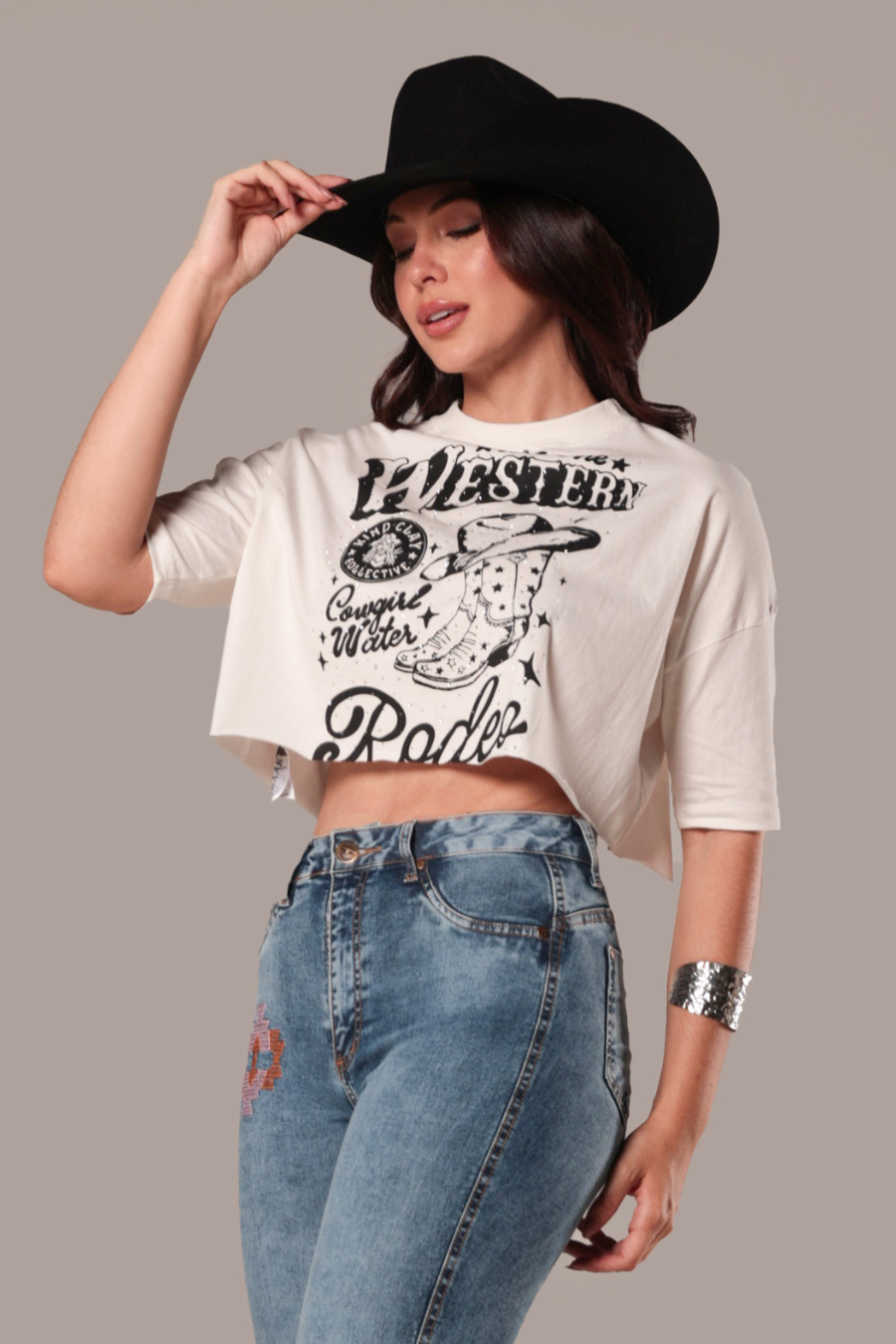 Cropped Oversized Off White Western Rodeo Texas Ranch Jeans Moda Country Conforto Algodão.