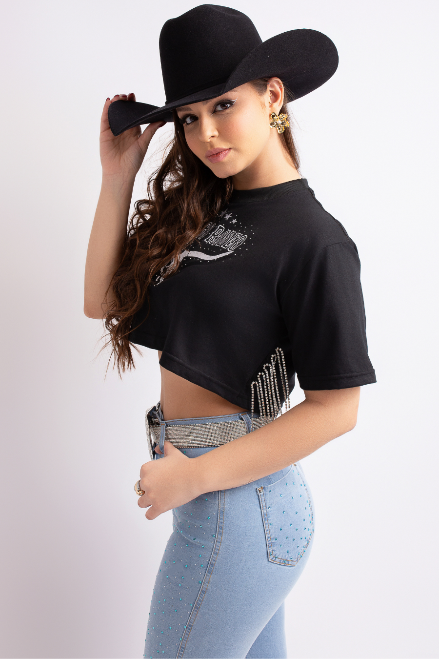 Cropped Preto Let's Go Rodeo Texas Ranch Jeans Algodão Feminino Lançamento Exclusivo Barretos Oversized Bordado Brilhos Strass Franjas Moda Country.