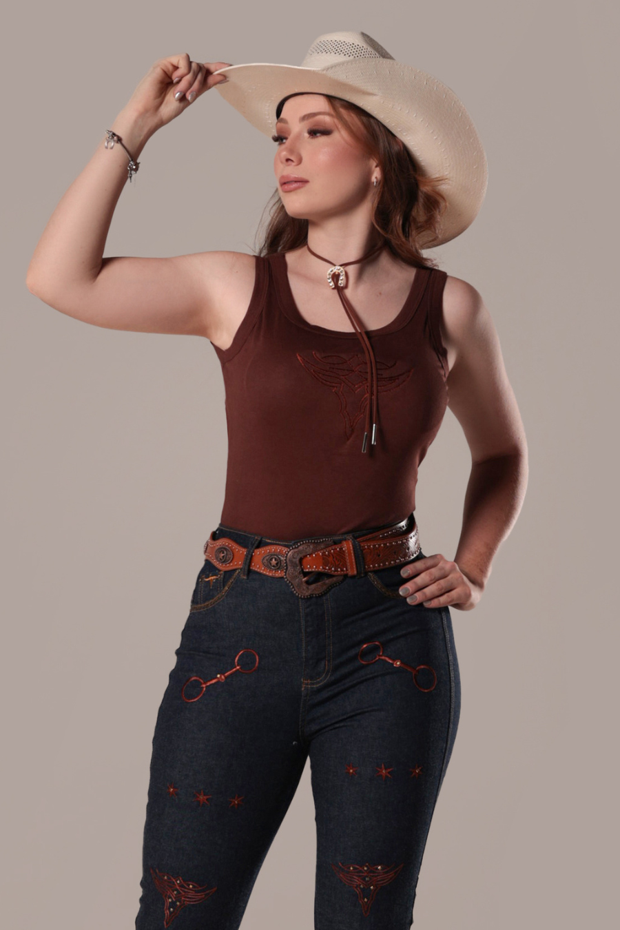Blusinha Regata Canelada Marrom Bordada Country Sessions Texas Ranch Jeans Moda Country Lançamento Exclusivo.