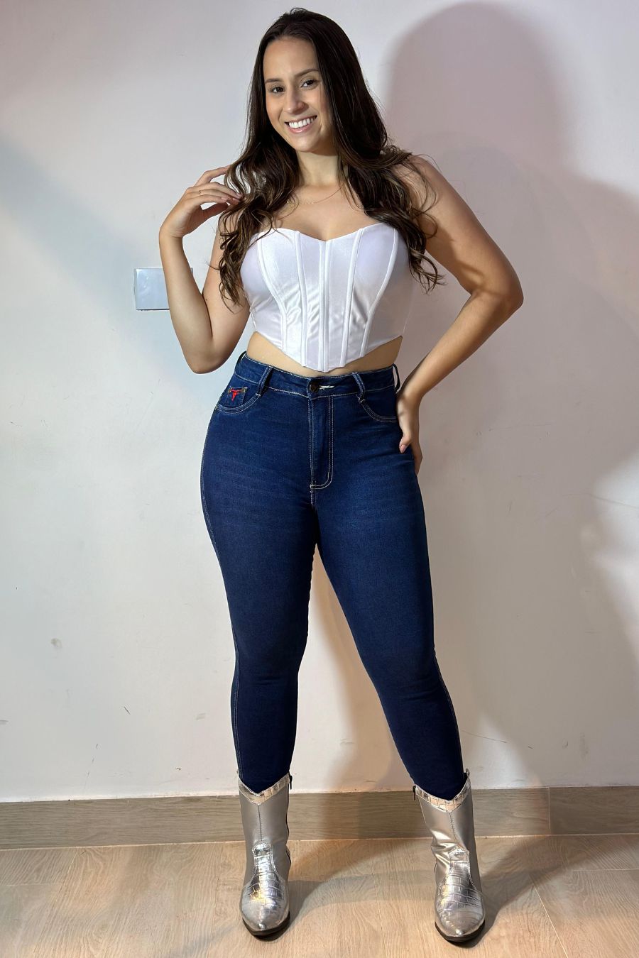 - Feita em jeans azul, de excelente qualidade e durabilidade, com alto teor de elastano que garante à peça muito conforto e modelagem;
